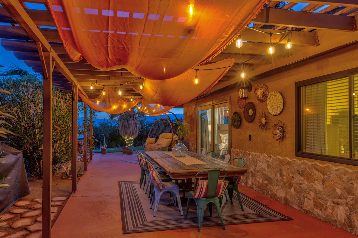 Welcome to Villa Champagne—your private desert oasis designed for slow mornings, cozy evenings, and unforgettable stargazing nights. Set on two peaceful acres just minutes from Joshua Tree National Park, this upgraded retreat invites you to unwind in the hot tub, enjoy movies under the stars, relax by the fire, and savor the calm of the high desert. Every corner was thoughtfully created to elevate your stay and connect you with the beauty around you.