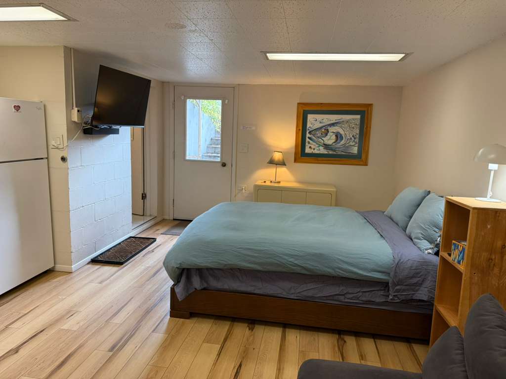 Our UPSTAIRS studio has a full kitchen, bath and laundry that sleeps up to THREE people. The kitchen, dining, living and sleeping areas are all open to each other, while the bathroom and laundry have a separate space within the Studio. You will be in walking distance of restaurants, coffee, shopping and movie theater. Enjoy the comforts of home while going on your Alaskan adventures.