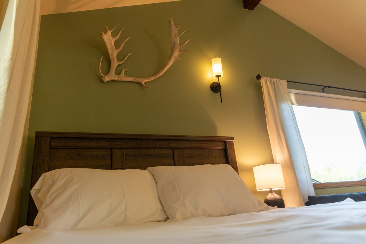 IG: rusticelegancelodge As you enter the cabin, you'll be greeted by the warm & inviting open-concept living space. The living room features a comfortable couch that folds out into a full size bed, a flat-screen TV, perfect for relaxing after a day of exploring the great outdoors. The kitchen is fully equipped with everything you'll need to cook up your favorite meals. Upstairs, you'll find a cozy loft with a queen-size bed, providing a peaceful place to relax after a long day of adventure.