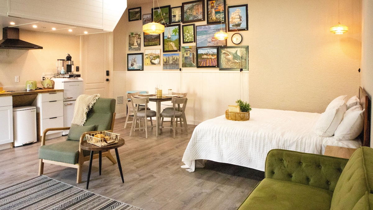 Experience comfort and style in this charming, pet-friendly space, perfect for short getaways. Enjoy the privacy of your own entrance, along with a full shower, cozy living room, dining area, and bedroom, all within one convenient layout. The fully fenced backyard, shared with other tenants, features a grill and fire pit—ideal for relaxing evenings outdoors. While the space includes a kitchenette, access to the main shared house may be available if you need a full kitchen or laundry facilities.