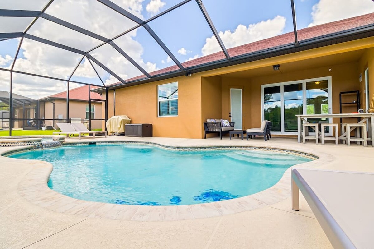 Brand New House. 3BR, two of which are spacious master bedrooms, 3 full baths. Huge screened lanai w/heated pool that backs up to a beautiful canal. Hall bathroom leads to the outdoor pool. This stylish pool home includes; modern interior design, new furniture. Everything is NEW! Fast-Wifi, pool toys, beach supplies, 3 large TV's, ping pong table, darts, office space. Popular beaches within 30-35min and #1 mineral hot spring in USA is 15min away!