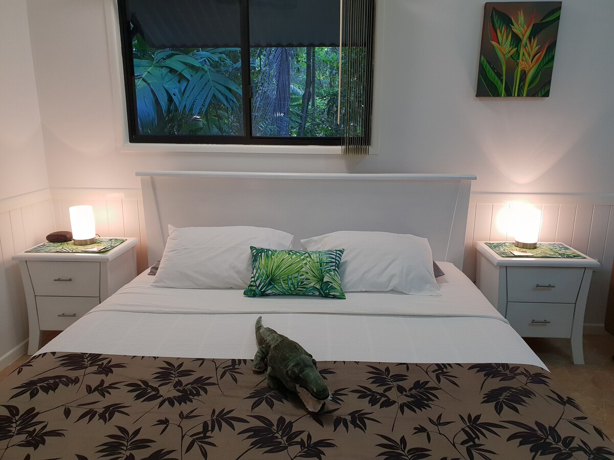 Relax and unwind in this fully self contained and air conditioned guest house nestled in tropical gardens, with large pool. Thoughtfully furnished, decorated and stocked to ensure your stay is amazing. 20 minutes from the city, university, hospital, The Strand, Murray Sporting Complex and the NRL stadium, with the award winning "Billabong Sanctuary" down the road. Your own transport is recommended. Our home is on the same property, so here if you need us, but your privacy is respected.