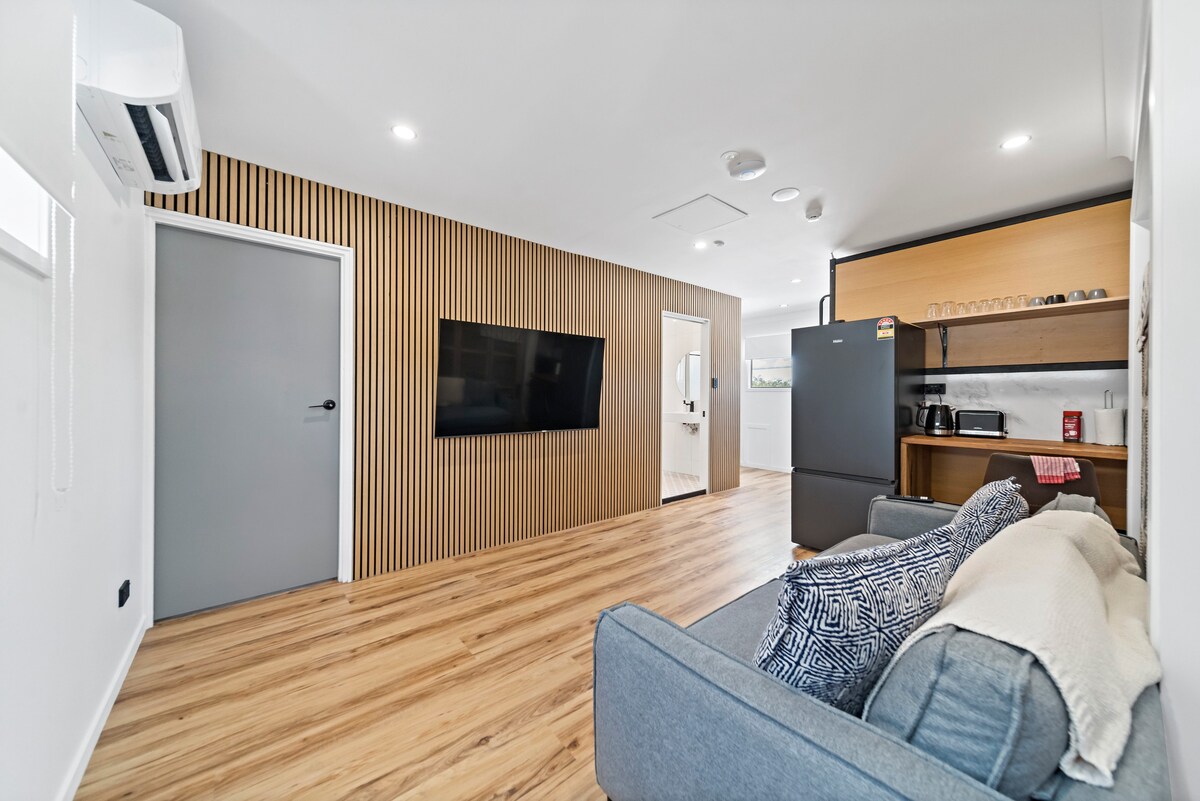 Newly refurbished self contained chalets to sleep 4. Fully equipped Kitchenette with full size fridge, dishwasher, microwave and 2 ring cook top. Private bathroom with shower. Wall mounted TV and air conditioning. Cute outdoor seating area for 2 on paved patio. Free laundry and parking onsite.