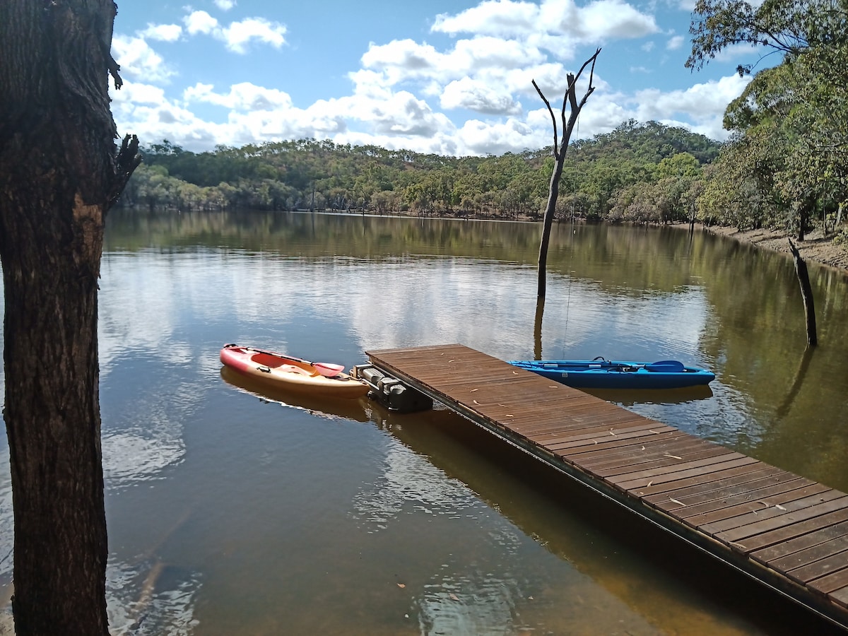 Recharge in this gem of a hideout perched on the creek bank above the deep swimming hole. A simple approach to comfort provides undercover alfresco dining areas, air conditioned sleeping rooms, a bathroom with all the basics and lots of outdoor spaces. At days end the background sounds of the rippling creek and a chorus of birdcalls settle you into this rustic, bushland shack. Dawn welcomes you and surprises you with a large mob of wallabies and a curfew of curlews reclining out front.