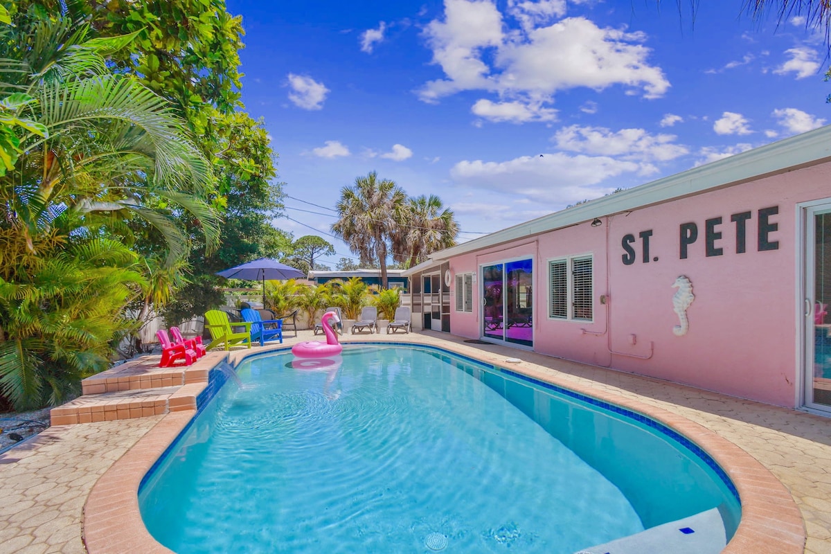 Welcome to our Lite Brite Beach Escape! No matter your age or interest, we have something for everyone! Heated & cooled pool ⭐ Mini-golf ⭐Lite Brite wall⭐Outdoor movie theater⭐ Pong⭐Bikes ⭐Beach gear ⭐Games ⭐Slide & playhouse We invite you to explore your creative and fun side while experiencing the beauty and wonders of Florida on the Gulf Coast! We provide a long list of basic amenities so your stay is seamless and stress-free. Just pack your personal belongings and we have the rest covered!