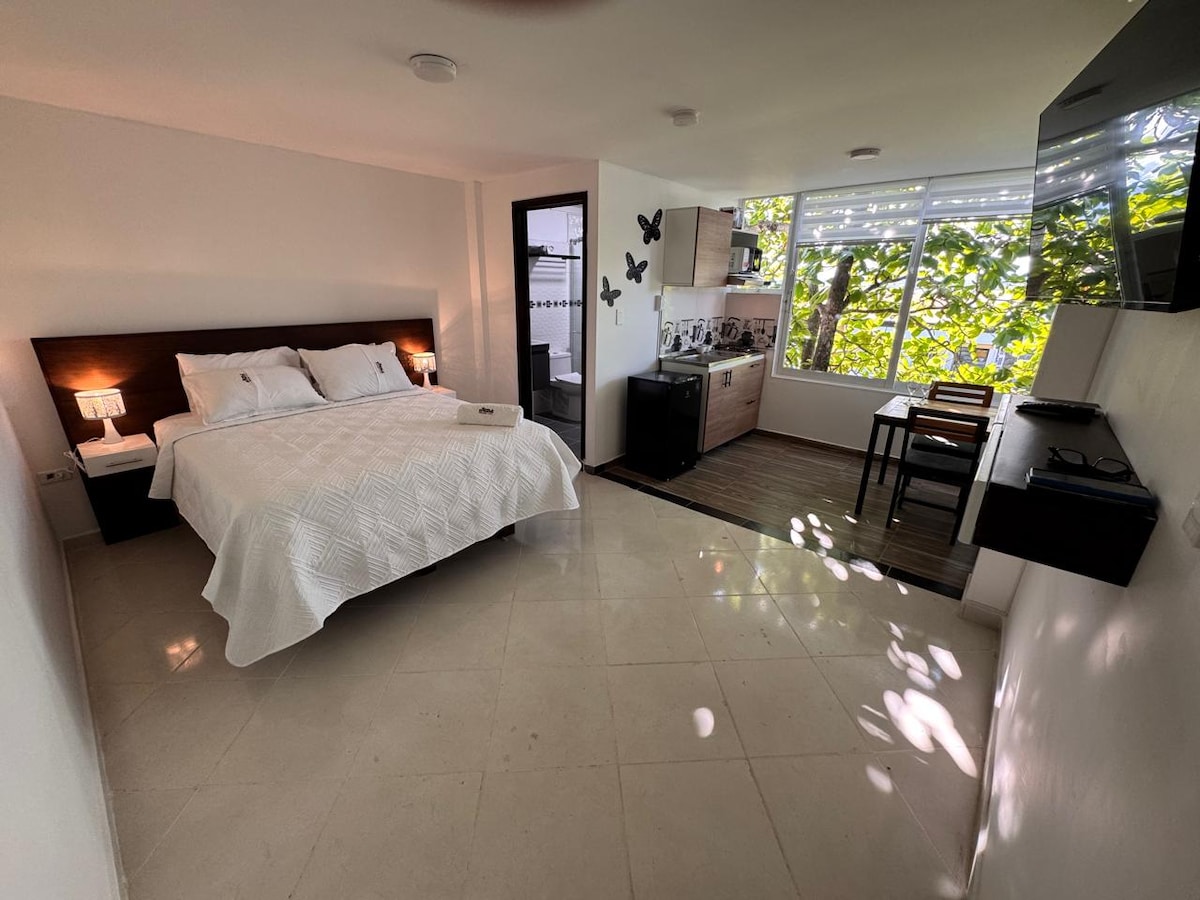 Ubicación centro Dormitorio principal para dos personas con A/C TV + Netflix + Wifi Escritorio junto a la ventana Closet con cajonera y colgador de camisas Comedor mesa silla y lampara de pie Cocina integral con estufa de 2 hornallas Ollas platos vasos tasas y utencillos de cocina de todo tipo. Hervidor de agua/licuadora/plancha/Microondas Nevera tipo minibar Baño con agua caliente / fría Secador de pelo