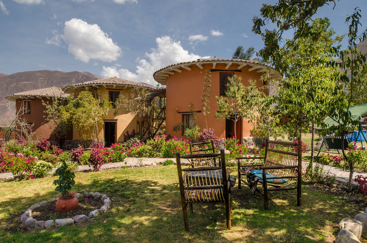 We are a five room hostel tucked away from the hustle just a few hours below Machu Picchu. Our lovely, natural clay finished rooms are complemented by a fully equipped kitchen, lush gardens, fish pond, waterfall, fruit trees, and a view that will make your socks roll up and down.