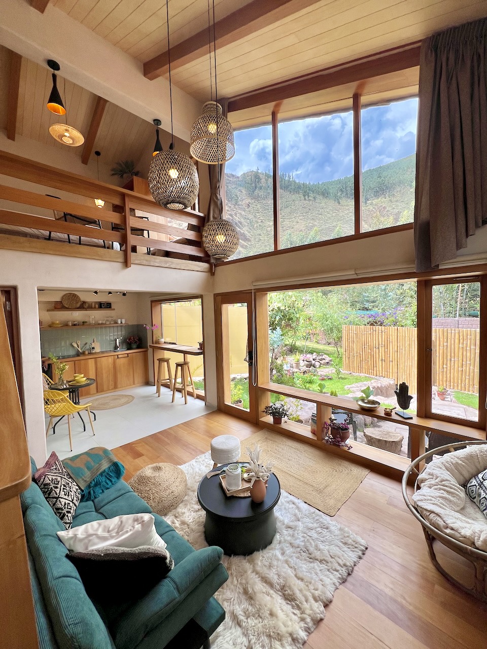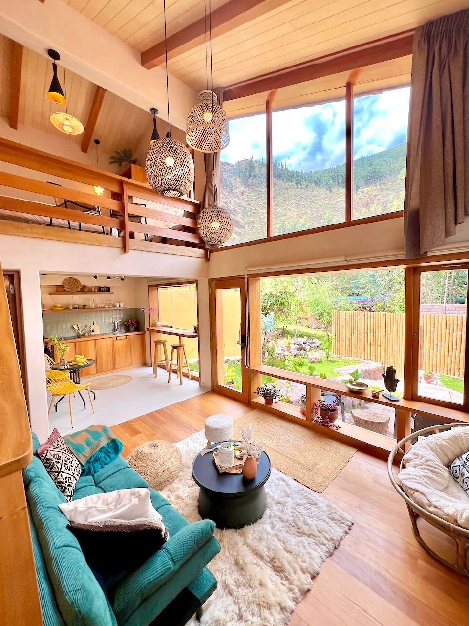 Relax in this bright glass loft in the heart of the Sacred Valley. Surrounded by mountains and gardens, it blends natural wood, soft textures, and serene views for a tranquil stay. Enjoy a cozy living area, kitchenette with a breakfast bar overlooking the garden, and the soothing sound of a nearby stream. Upstairs, unwind in a loft bedroom with a king bed and window bench. Step outside to your private zen garden — perfect for morning coffee or sunset reflection.
