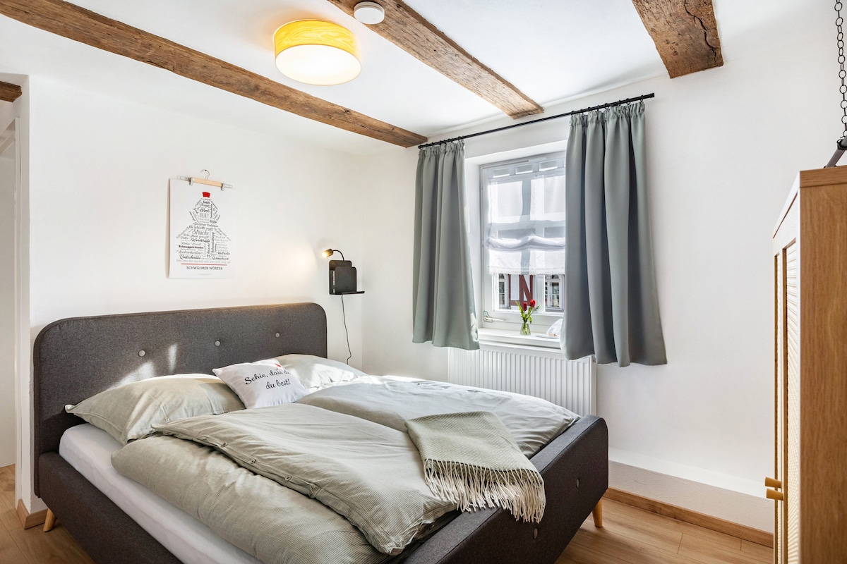 Our historic half-timbered double room offers cozy comfort. The bed has two comfortable mattresses with fresh linens for a restful night's sleep. The bathroom includes toiletries, a hairdryer, and towels for your convenience. Breakfast is not currently available, but there are two excellent bakeries within walking distance—perfect for starting your day. The guesthouse operates contactlessly; your hosts live nearby and are available via the booking platform.