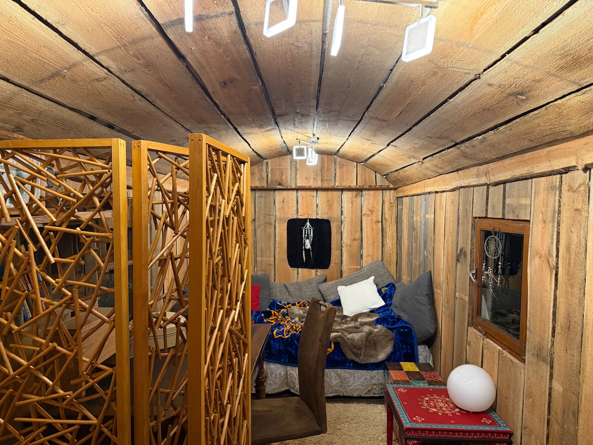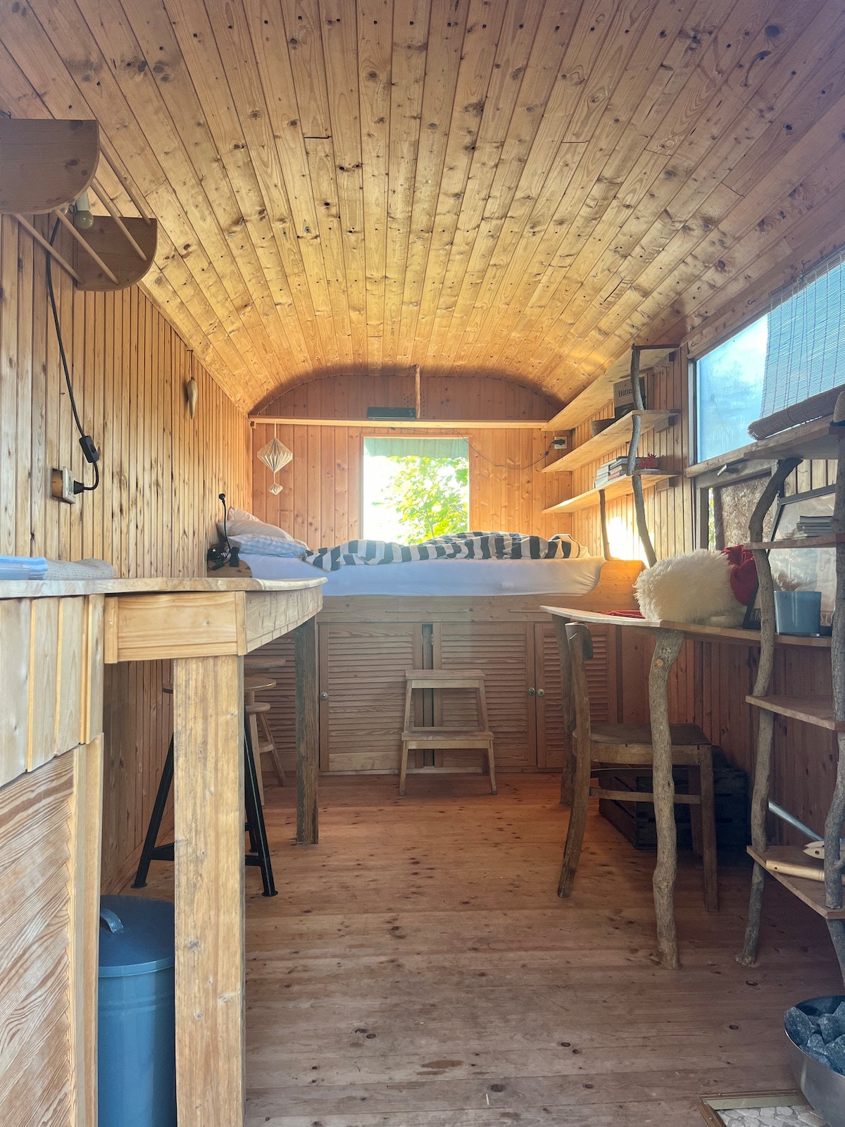 Ihr findet unsere Löwenzahn-Lodge auf einer kleinen Wiese am Rande der Ortslage. Der in 2024 neu ausgebaute Wagen bietet alles, was ihr für euren Aufenthalt benötigt. Neben einer kleinen Küche steht euch ein Doppelbett sowie ein ausziehbares Sofa zur Verfügung. So könnt ihr mit bis zu vier Personen hier übernachten. Der Wagen verfügt über Strom und Wasser. Dusche und WC befinden sich nur 100m entfernt. Das umliegende Land und der idyllische Ort laden zum Endecken oder Seele baumeln lassen ein.