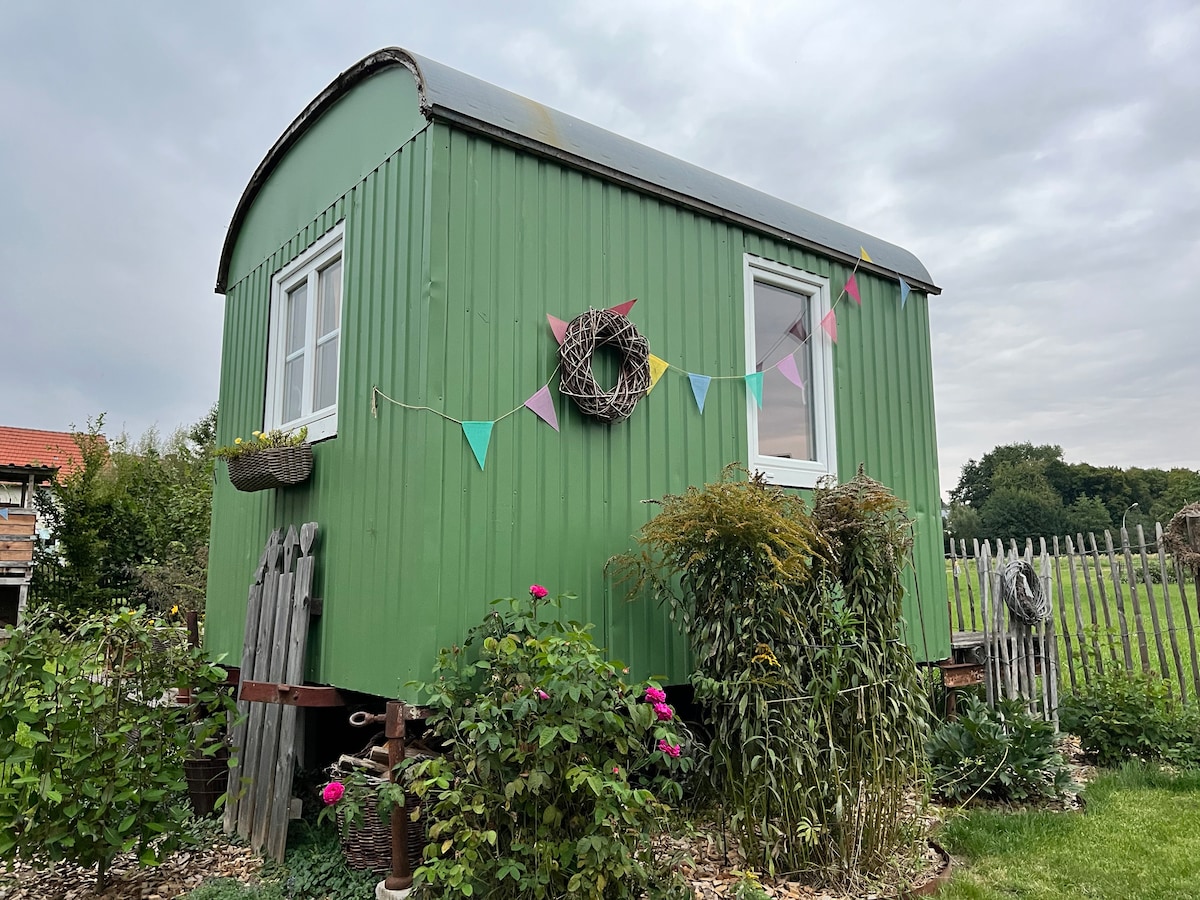 Gemütlicher Bauwagen für 2 Personen im Garten, am Ortsrand, aber dennoch zentral. Frühstücksmöglichkeiten fußläufig, die A7 ist in 10 Minuten erreichbar – ideal für Durchreisende. Perfekt als Zwischenstopp für Radfahrer & Wanderer: E-Bikes können sicher untergestellt und geladen werden. Mit Strom, Heizung, Kaffeemaschine & Wasserkocher. Bad mit Dusche/WC durch den Garten erreichbar (circa 10 Meter). Eine Feuerschale für entspannte Abendstunden steht bereit. Bettwäsche und Handtücher inkl.