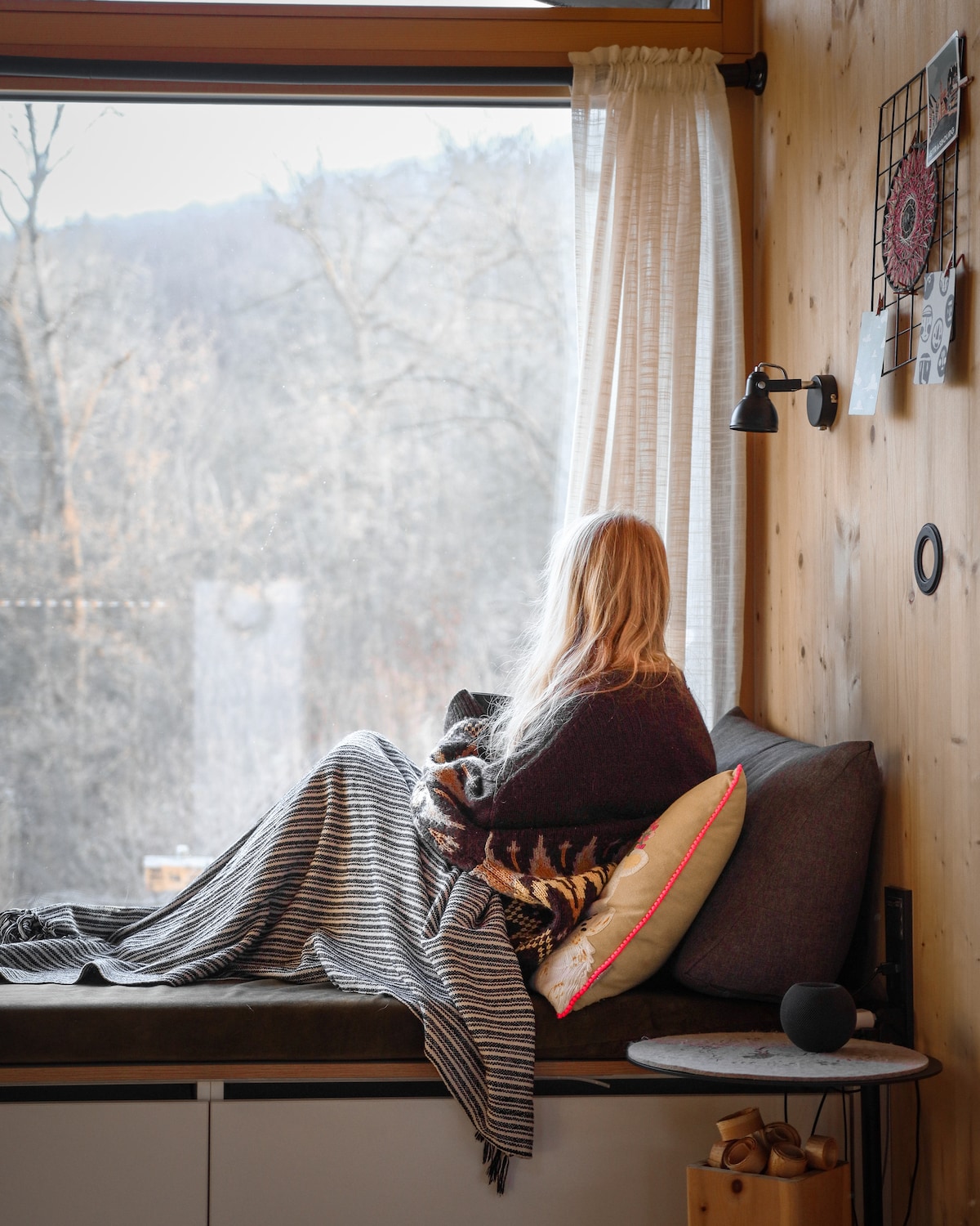 NEU: Direkt neben „Mono" steht ein weiteres Haus, „Nest im Wald“. Kann man auch besuchen. Oder beide… „Mono“ ist ein vor Jahrzehnten ausgebauter Trailer. Im Zuge einer Komplettsanierung bekam es 2020 rundum ein Timber-Frame-Skelett (neues Dach, neue Dämmung etc.) und damit eine erste Etage. Größe: 3,20 mal 13 Meter. Es heißt "Mono", da sein Außen, so wie auch jeder Raum innen, von hauptsächlich einer Farbe bestimmt wird.
