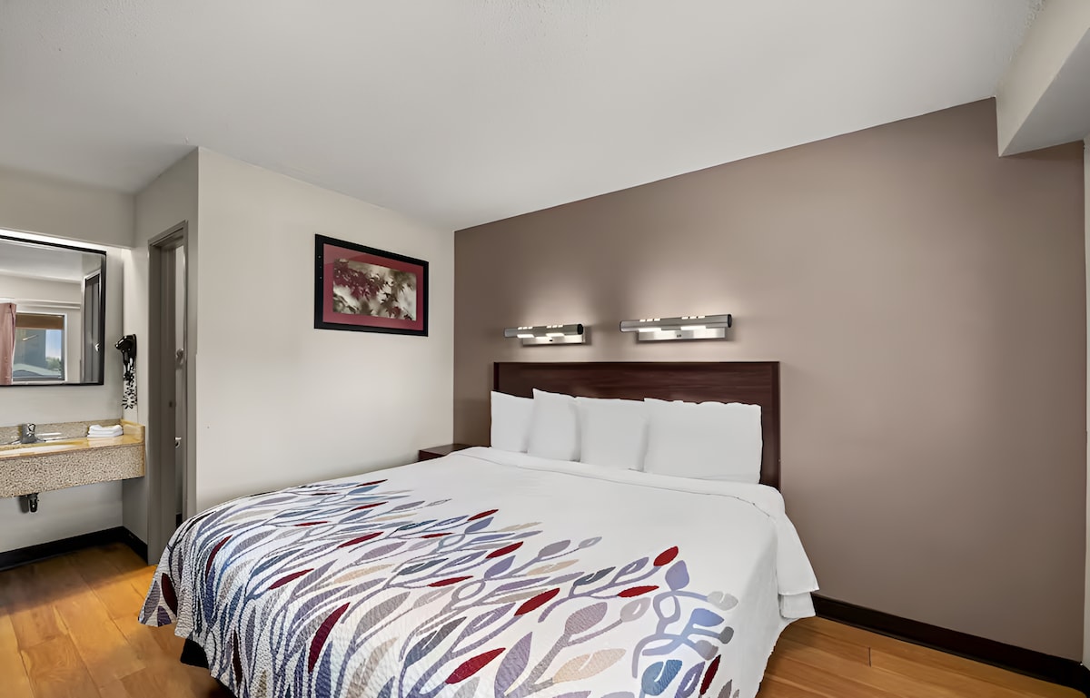 Features * Sleeps 2 1 King bed 1 Bathroom Amenities * 370ft²• Limited view• Non-smoking• Mini Fridge• Wireless Internet• Smart TV• Free Toiletries• Air conditioned• Room Safe• Lounge Area• Swimming Pool• Desk• Linen and Towels Provided• Hairdryer• En-suite Bathroom This room has a seating area, air conditioning and private entrance, mini fridge, smart TV, and free WIFI. Private bathroom is equipped with a shower. Free parking on the property premises.