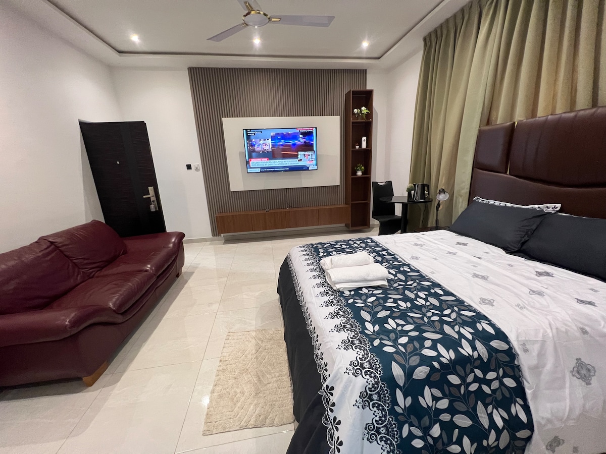 Majestic Luxury Apartment is a lovely place for relaxation, business and vacation. It's located at Borteyman, on the Accra-Tema Motorway, 25 minutes drive from Kotoka International Airport. Majestic has unlimited high-speed WiFi, large parking lot, and very clean 2 bedroom air-conditioned rooms in a serene environment with 1 bathroom ensuite, kitchenette, elegant dinning room, and furnished spacious living room. Security is available on premises 24/7. Airport pickup and drop-off on request.