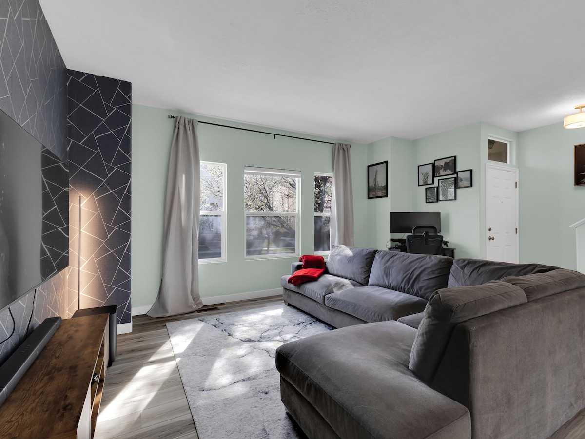 Central hub for work or play! Reach downtown Salt Lake City or the airport in 10 min while relaxing in a spotless 3-bed home. Fully equipped kitchen Fast Wi-Fi & 75" TV for streaming Gym and office area Free parking for 4 cars (2 in garage, 2 in driveway) Washer and dryer included Centrally located near downtown, airport, restaurants, hiking, skiing, event venues.