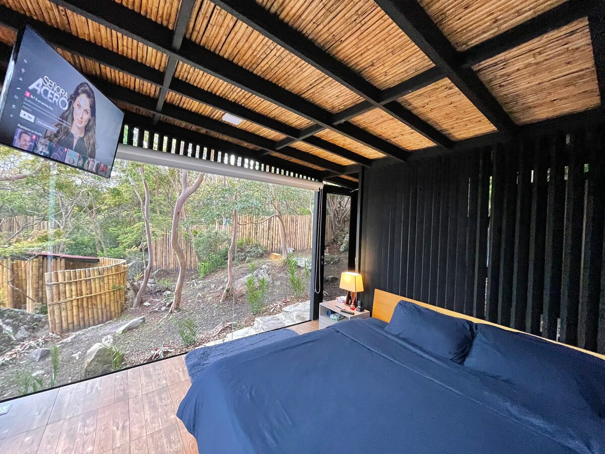 Paneo Glamping, la cabaña Bruma tiene capacidad para dos adultos, la medida es de 35 m2, tiene malla catamarán, fogata de bioetanol, cama Queen, agua caliente, minibar, freidora de aire, cafetera. Te incluimos el desayuno, tenemos opción vegana si prefieres. Tendrás acceso a nuestra quebrada natural dentro de la finca. Nos encontramos en finca con seguridad, parqueadero privado, acceso para cualquier tipo de vehículo a solo 20 minutos de Bucaramanga con un clima entre 18°C y 26°C.