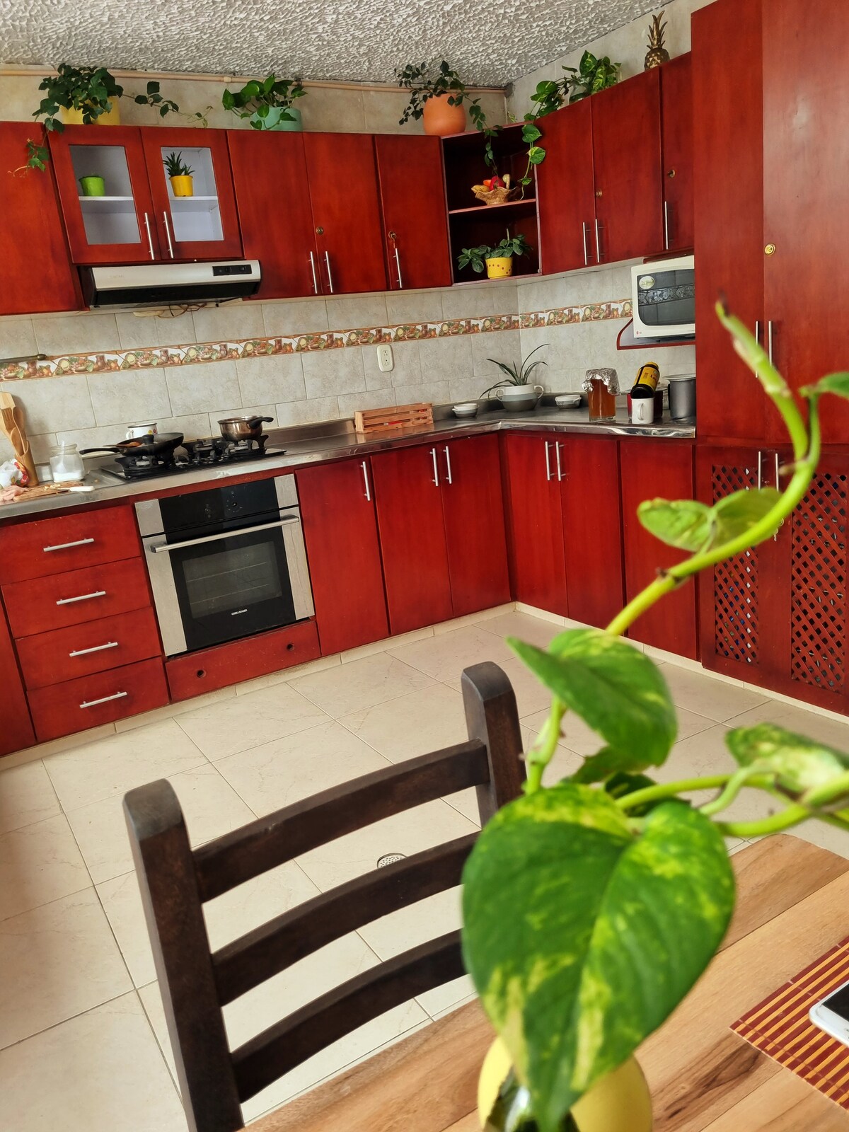 Casa de dos plantas con jardín y patio trasero, cocina amplia y totalmente equipada para cocinar. Las habitaciones son grandes y cómodas. Está ubicada en Los Pinos, un barrio tranquilo y fresco, rodeada de árboles, montañas y pajaritos. En la zona hay tiendas, panaderías, farmacias, restaurantes y un centro comercial. Nos encontramos a 10 minutos caminando del estadio y a 25 minutos del centro. El servicio de limpieza está incluído todos los días.