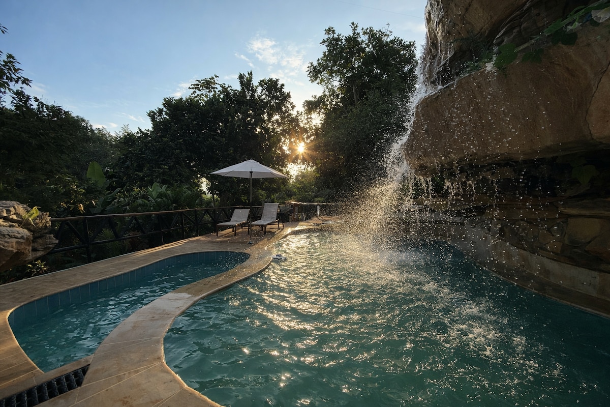 Hermosa casa campestre rodeada de naturaleza – ideal para descanso y encuentros especiales Disfruta de una acogedora y amplia casa campestre, rodeada de zonas verdes, árboles frutales y jardines cuidadosamente mantenidos, perfecta para descansar, compartir en familia o realizar reuniones privadas en un entorno tranquilo y natural. Contamos con un Jacuzzi para 12 adultos con cascada, hidro jets a un 1 metro profundidad y Piscina para 12 niños de 70 cm fondo y con hidro jets