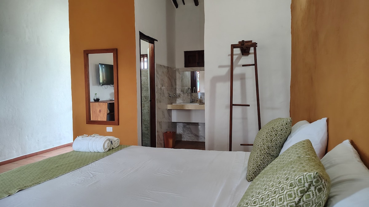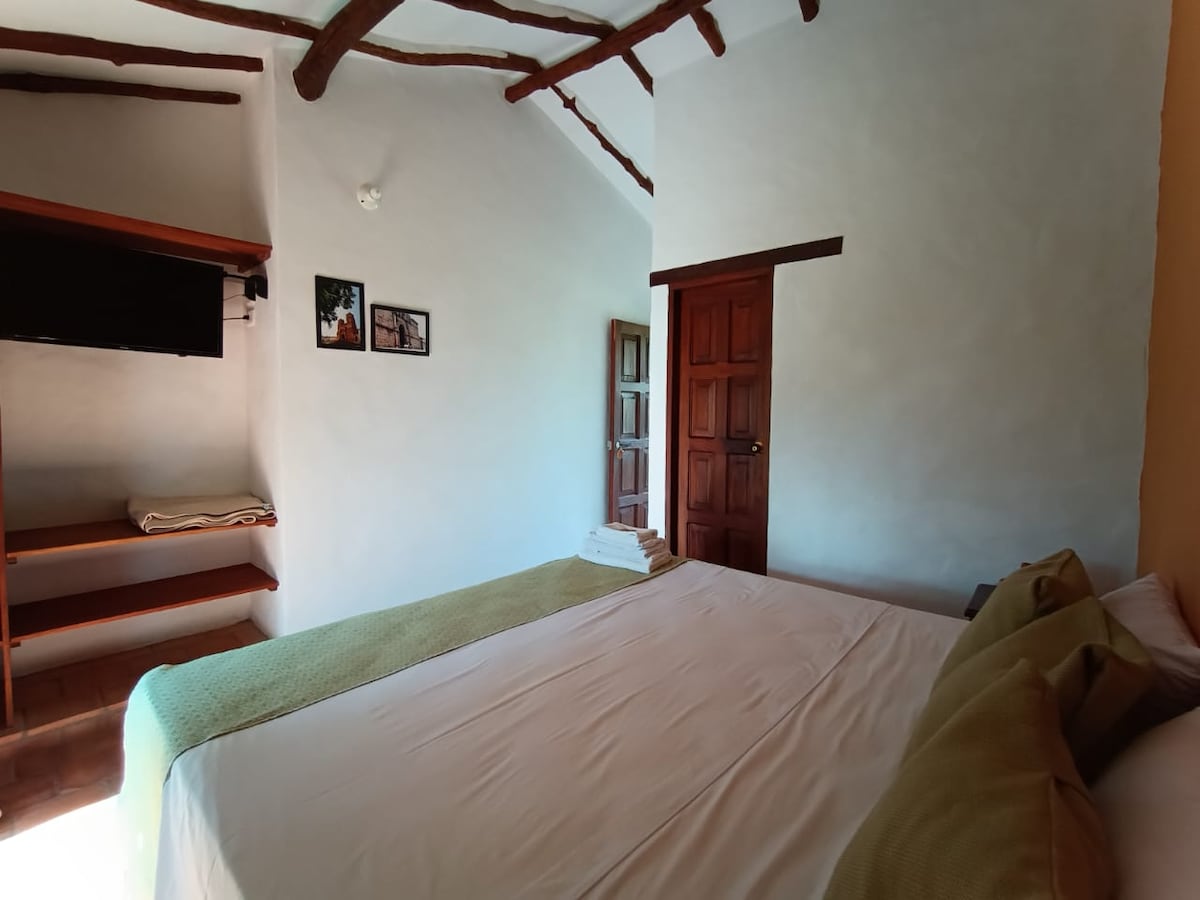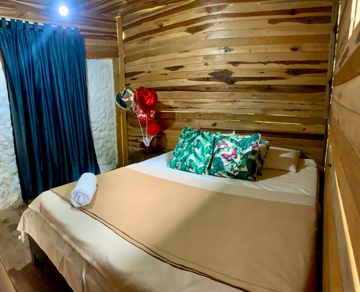 Habitación tipo cabaña, perfecta para parejas con niño. Cama extra grande, baño privado, TV, wifi y acceso a un balcón compartido con vistas al jardín y zonas verdes. Espacio cómodo y tranquilo para disfrutar la naturaleza con todas las comodidades. Ideal para desconectarse en familia; además, disfrutarás de deliciosos desayunos incluidos en tu reserva.