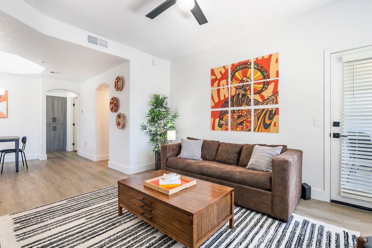 Experience Scottsdale in a spacious luxe condo with spectacular vibes and amenities. The Unit: → Lightning Fast Wi-Fi → Dedicated workspace + Monitor → Comfortable King Bed → 60" Living Room TV + Netflix → 55" Bedroom Room TV + Netflix → Fully Stocked Kitchen → Washer & Dryer → Private Parking 5 Star Amenities: → Resort Pool and Jacuzzi → Cabanas and Lounges → Full Size Gym Ideal for business travelers and corporate clients looking to experience the rich culture of Scottsdale in style.