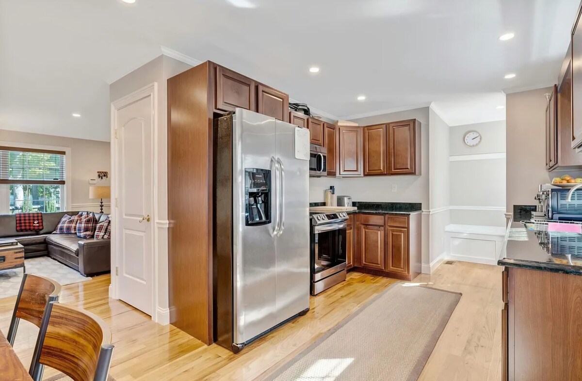The house is located on a .35 acre lot with plenty of outdoor dining space and a huge grass area with a firepit & hammock. There are 2 floors. The first floor has an open floor plan with a connecting kitchen, dining room, and living room. The kitchen is well equipped with a dish washer, electric stove/oven, refrigerator, and coffee bar. There is also a bedroom on the 1st floor with 2 full-sized beds. The 2nd floor has 3 bedrooms and a loft/den area. The three bedrooms on this floor have 1 queen bed+futon, 2 full-sized beds, and 2 twin beds (which can be made together to form a king upon request), respectively. All rooms have AC. There are 2 full bathrooms (1 on each floor) and a washer/dryer. Guests have access to the entire house and backyard area. We respect your privacy, but we are accessible if you have questions or need anything throughout your stay. Greenport was voted one of the prettiest towns in America by Forbes magazine. It has a vibrant and relaxing culture, offering access to beaches, wine tasting, and wonderful restaurants. The Shelter Island Ferry and Hampton Jitney stops are nearby. We are just a few short blocks from the Hampton Jitney stop, the LIRR station, and the Shelter Island Ferry. No car necessary - you can walk wherever you need!