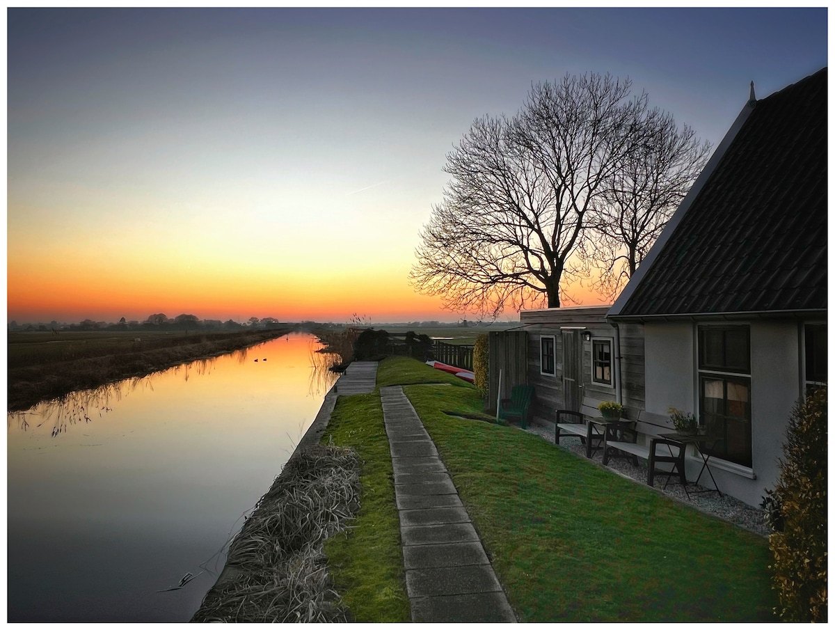 Luka's Hut, our beautiful eco-cabin, sits on the banks of the Ganzendiep river in Overijssel. Huge windows provide stunning Dutch views onto the river, the grass meadows with cows & sheep and a picturesque village in the distance. The river is quiet water so have a sauna & a swim, take out the kayak, big canoe or SUPboard. We have a heatpump for the floor heating, and used upcycled items such a charming wood-stove, a fantastic bath, a fully-equipped kitchen, bikes, a firepit & trampoline.