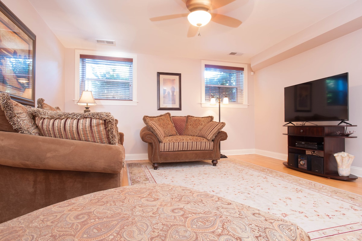 Large 1 bedroom space tastefully decorated and well equipped. Sleeps 4 (5 with available inflatable). Queen bed in BR, full size futon in LR. Spacious enough for 2 to work comfortably. Use of the patio, fire pit and grill. Located in vibrant Lincoln Square. Steps to the Rockwell brown line el station, restaurants, a bagel shop, and yoga/massage studio. A few blocks away are shops, restaurants and a movie theater! Easy street parking with free permits. Level 2 EV charger available.