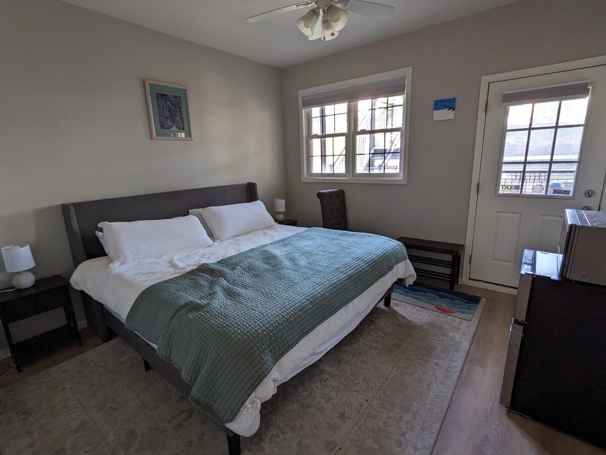 Cozy English garden apt (300 sq ft) w/ priv. entrance & free offstreet prking. 4 min walk to Blue Line. Brightly lit / high ceiling. Adjustable Tempupedic memory foam QUEEN bed plus futon in lvng rm. Kitchenette w/ mini-frig, Nespresso & Keurig, toastr ovn, microwv, and waffle maker w/maple syrp. Designer bath. 30+ restaur/bar nearby (see GUIDE BK in LOCATION). Self check-in. Flexible cancel. Early lugg. drop. A space to unwind in -- art-filled and artistic in design, NOT bland or IKEA like!