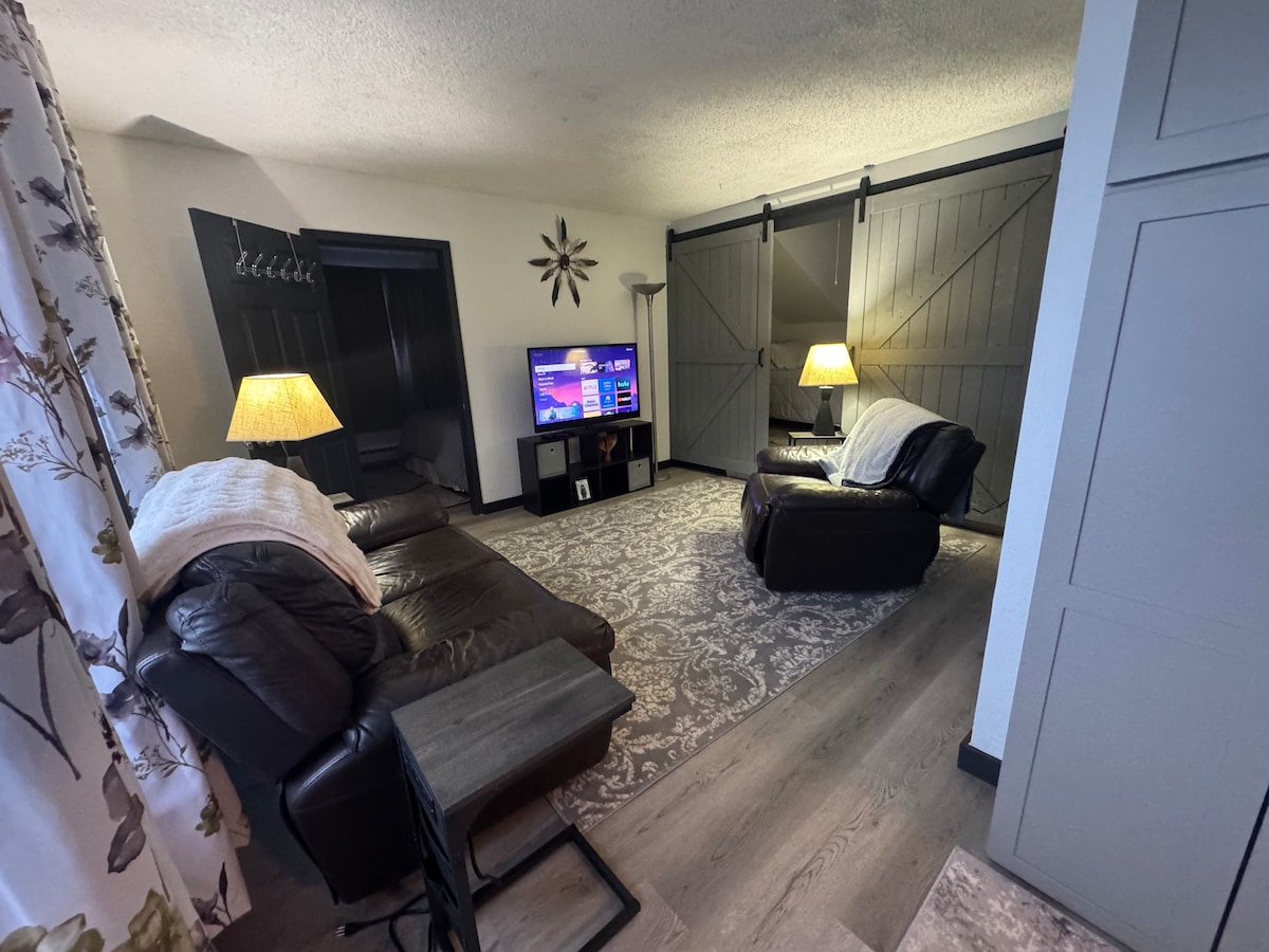 Our location is unbeatable, offering you a truly central home base for exploring the northernmost city in the United States. Two bedroom that includes one queen bed, and one twin bed loft style barn door closure, located on the second-story unit. Completely remodeled from top to bottom and is ready for you to enjoy. We've designed this space to be your sanctuary, featuring a bright, modern kitchen, comfortable furnishings, and reliable Wi-Fi.