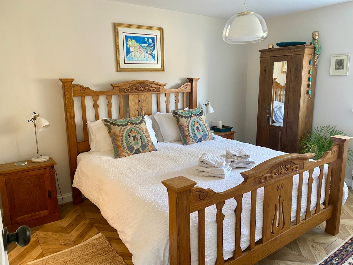 Our cottage is a quirky wooden framed, tin clad cottage, sitting on the banks of a stream, next to our house. Although small it feels much bigger with a fully equipped kitchen, bedroom and bathroom. It can sleep 4 people with the use of the sofa bed. It features a wood burning stove, (it also has central heating ;-)), a gorgeous mural across one wall, a veranda for sitting and watching the world go by, oh and it also has full WiFi, smart TV and sound system if this all sounds a little rustic.