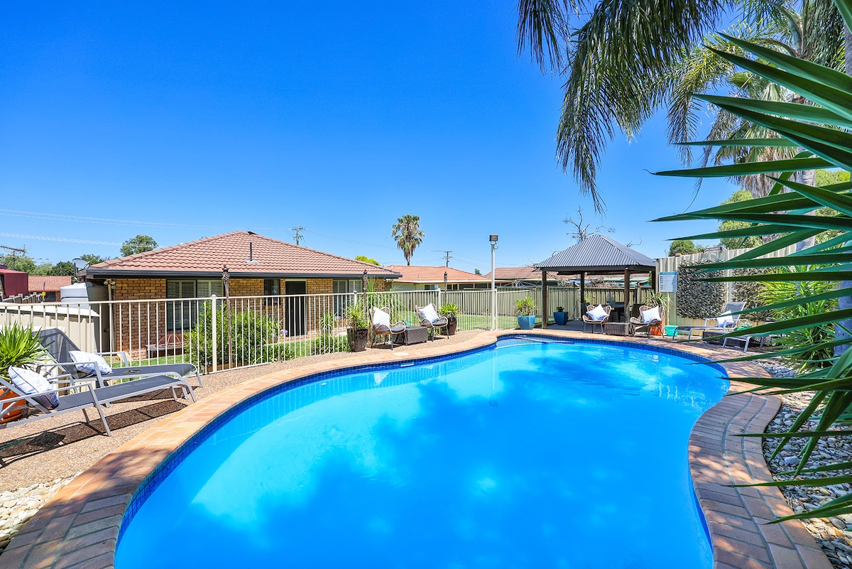 Relax with the whole family at this peaceful place to stay during the country music festival. This unique home offers 3 bedrooms, with aircon and ceiling fans x2 queen beds and 1 double bed main bedroom with ensuite. 2 lounge rooms with TVs. Large kitchen, dining table and a bar. X 2 aircon and evap cooling throughout large entertaining area with tv, bbq, pool table and saltwater swimming pool that lies infront of a bali hut . 2 car under cover parking close to bus stop for your convenience.