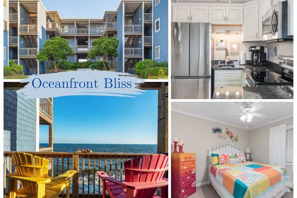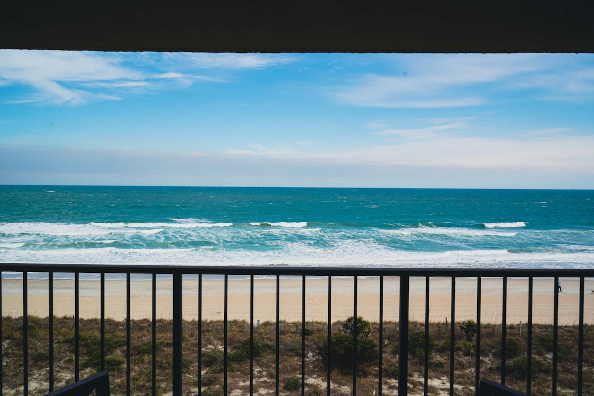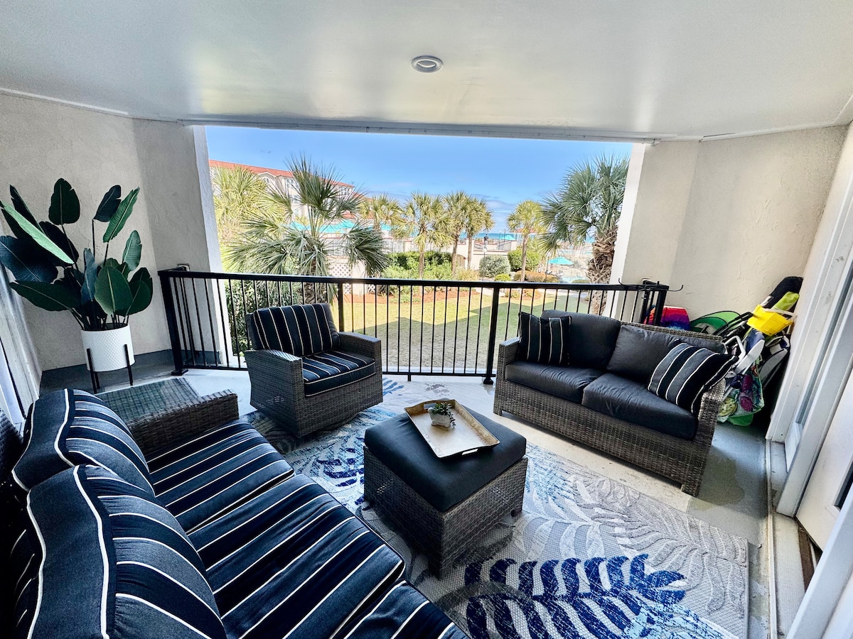 Beautiful OCEANFRONT condo with ocean and pool views! This condo is on the first floor with an open concept! Fully stocked kitchen, oceanfront master bedroom, queen bed, with private bath and sliding doors to the ocean front balcony. The second bedroom has two twin bunk beds. Queen size pull out sofa in living area. The condo community offers a large pool, walkway to the beach with showers and elevators. Playground pavilion and grilling area with basketball, cornhole and other games. Come RELAX!