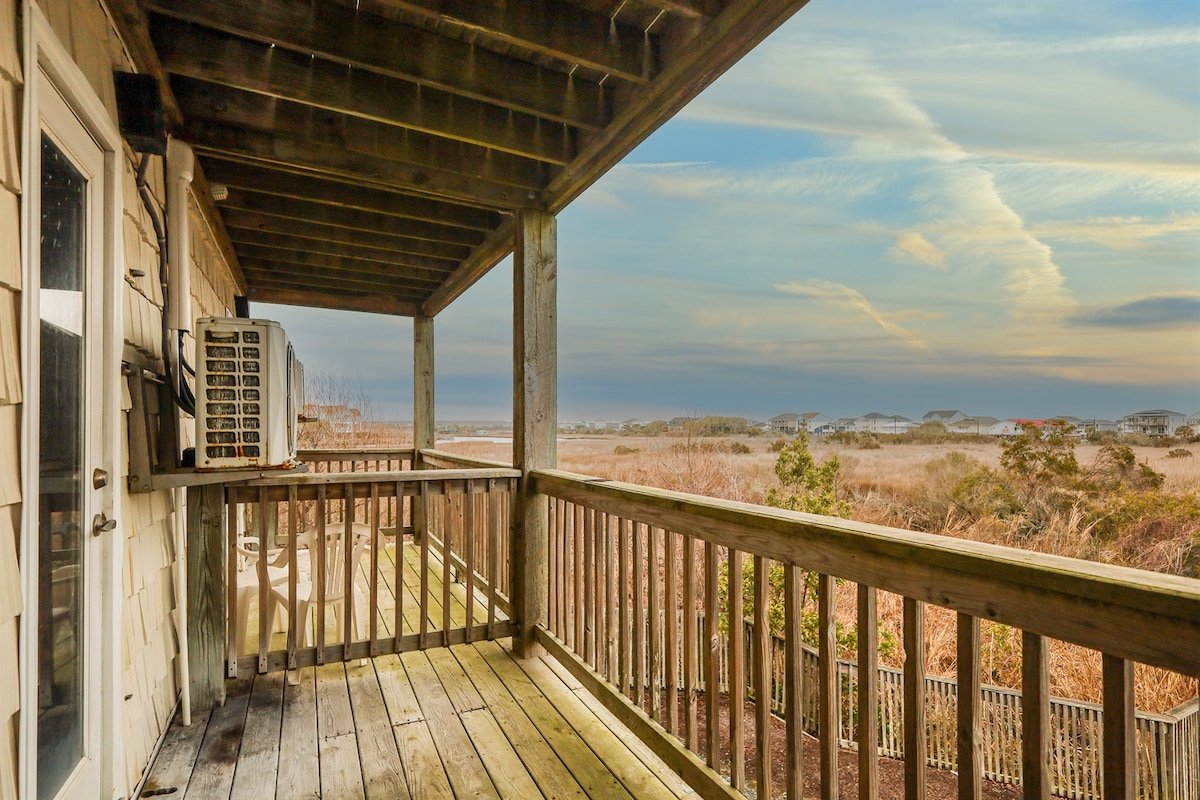 Relax with the whole family at this cozy OCEANFRONT condo on peaceful North Topsail island. 11/1-1/31- Enjoy Holiday time at dolphin view Wake up to the sound of crashing waves and enjoy your coffee on the balcony while the sun rises and the dolphins play. With enough beds to sleep 5 and a full kitchen, this is the perfect place to make home base for your North Carolina beach vacation. *shoreline changes constantly- tides schedule available *NC coast is humid-dehumidifiers in unit