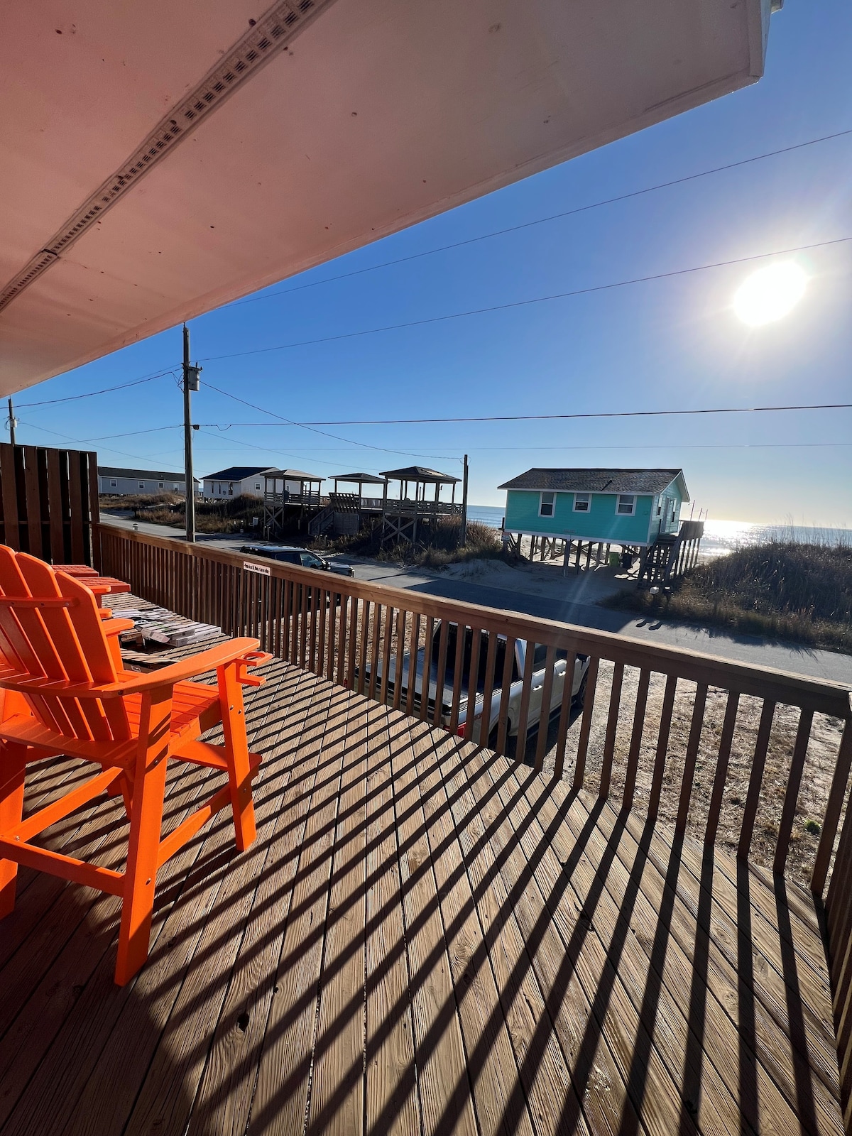 Come and get your Vitamin Sea - sunshine, fresh air, and salt water! Charming Oceanfront 2 bed 1 bath apartment with beautiful views from private deck and walkway directly to the beach. Perfect for singles, couples, or small families. Walk to the best dining and shopping in Surf City. Everything within 5-10 minute walk. Easy access to new high-rise bridge. All Vinyl flooring. All linens are included. Plus household package, charcoal and gas grill and more!