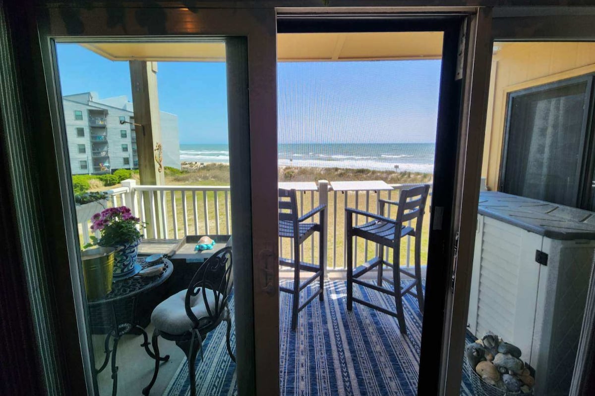 Relax with the whole family at this cozy OCEANFRONT condo on peaceful North Topsail island. 11/1-1/31- Enjoy Holiday time at dolphin view Wake up to the sound of crashing waves and enjoy your coffee on the balcony while the sun rises and the dolphins play. With enough beds to sleep 5 and a full kitchen, this is the perfect place to make home base for your North Carolina beach vacation. *shoreline changes constantly- tides schedule available *NC coast is humid-dehumidifiers in unit