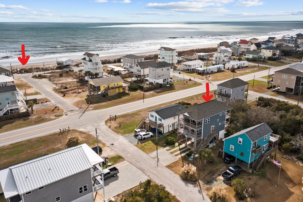 Welcome to "Toes In The Water", our beach home steps away from the beach w/ sound views. This updated house with open kitchen/dining/living room has 4 bdrms, 2 baths, & game room . Outdoor space includes multiple decks & screen porch. Patio has hot tub, dining table & chairs, fire pit & outdoor shower. 1st level is a game room w/ ping pong, darts, & more. Includes beach cart, umbrella, Shibumi, bikes, boogie boards, 2 person kayak, 2 paddle boards, surf board, & Level 2 EV charger.