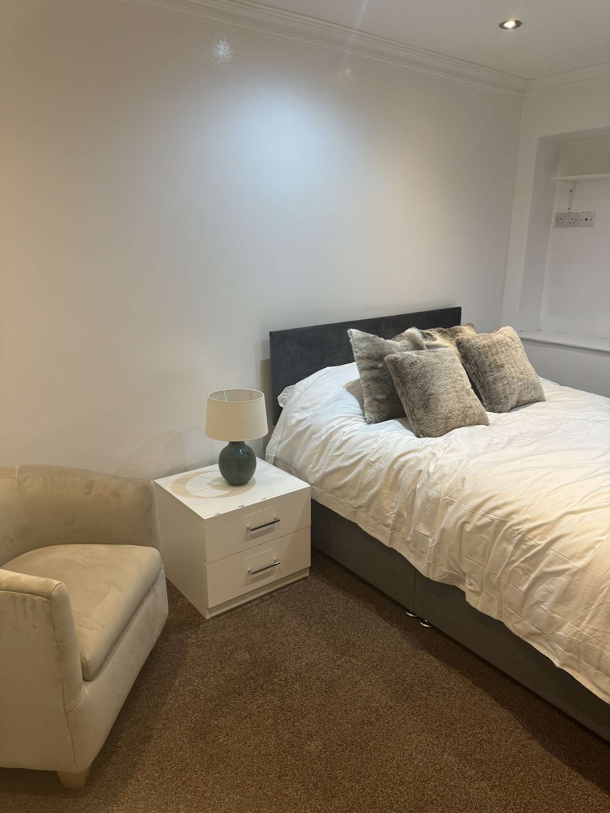 Cosy two bedroom first floor apartment which is well equipped for all your self-catering needs. Beautifully decorated throughout. The front room is comfortable light and airy. There is a table to use as a work space or for dining, smart tv, sky, broadband and dvd. Kitchen & bathroom are of good size with all the comforts you will need. Both bedrooms are spacious with plenty of drawers & a wardrobe to use. There is a small rear garden with patio area.