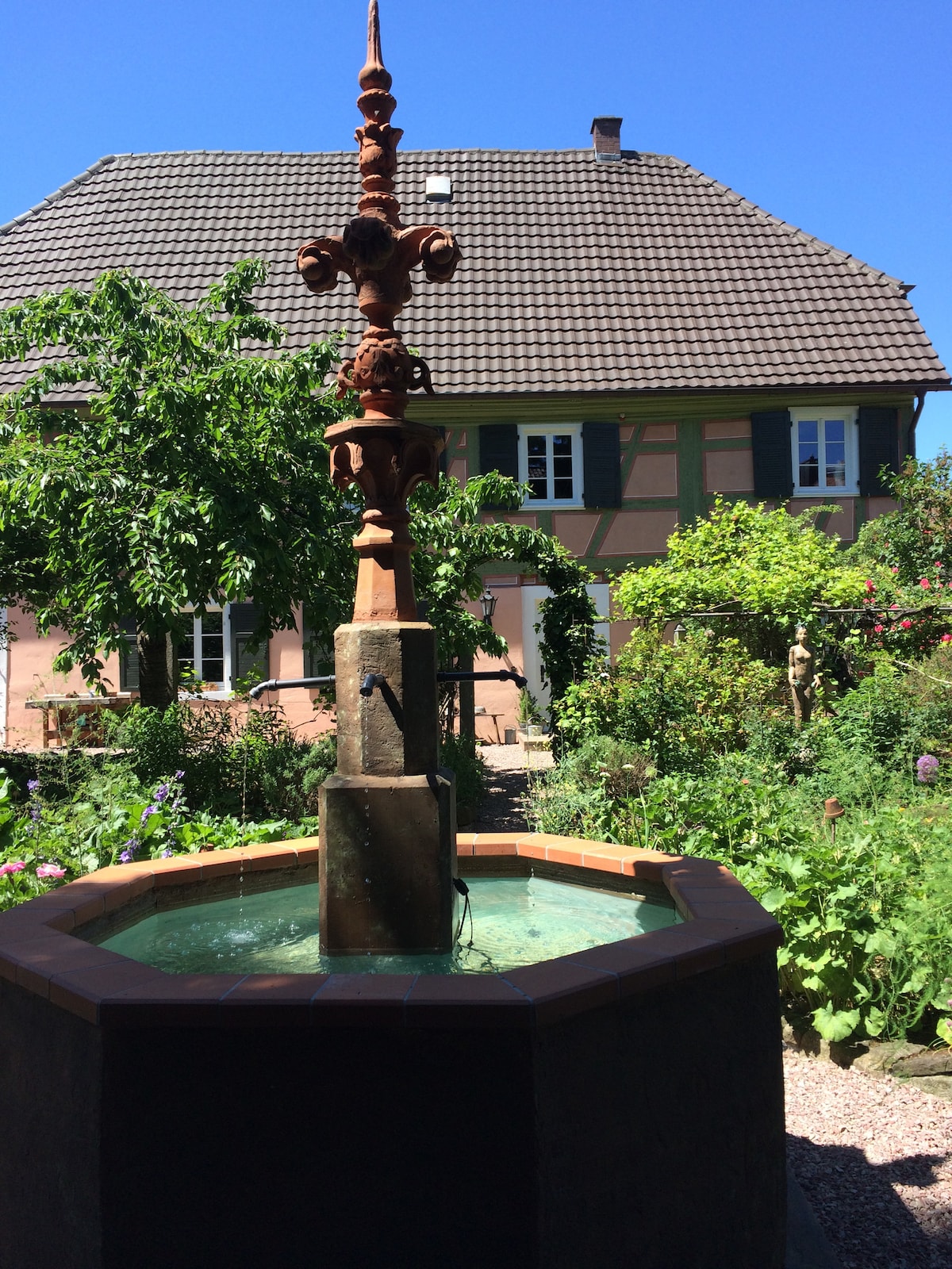 Wohnen in einzigartigem Ambiente: Fachwerkhaus im historischen Altstadtkern von Mahlberg. Teile des Hauses sind über 800 Jahre alt. Liebevoll restaurierte Wohnung mit antiken Möbeln. Weinumrankter Pavillon für das Frühstück in der Morgensonne. Sonnenliegen im Garten neben dem plätschernden Brunnen laden zum Entspannen ein. Weinkeller sowie großer Fitnesskeller mit separatem Zugang inklusive.