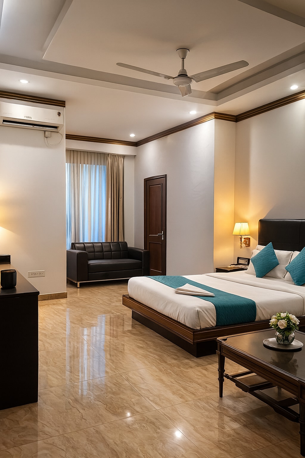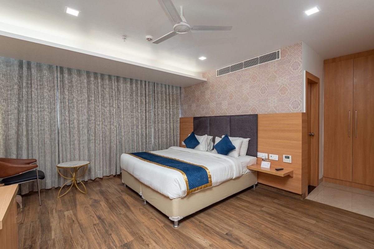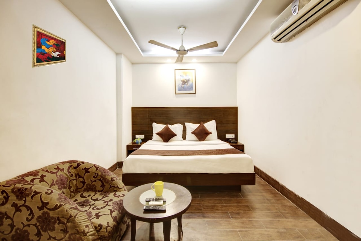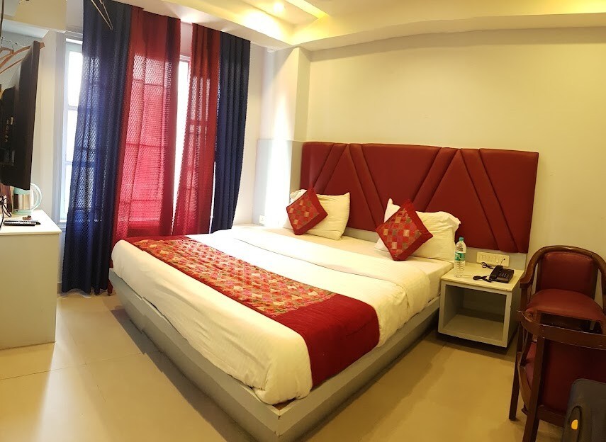 ◆Comfortable & stylish hotel room perfect for solo travelers or small groups. ◆Easy access to : ✔Sir Ganga Ram City Hospital – 500 meters ✔Apollo Spectra Hospitals – 700 meters ✔Karol Bagh Market & Metro Station – 1 km ✔Indira Gandhi International Airport – 19.9 km ◆Room includes a TV, mini fridge, and ensuite bathroom. ◆On-site restaurant with ample seating & air-conditioning. ◆Welcoming reception area with plush sofas, TV & lift access.