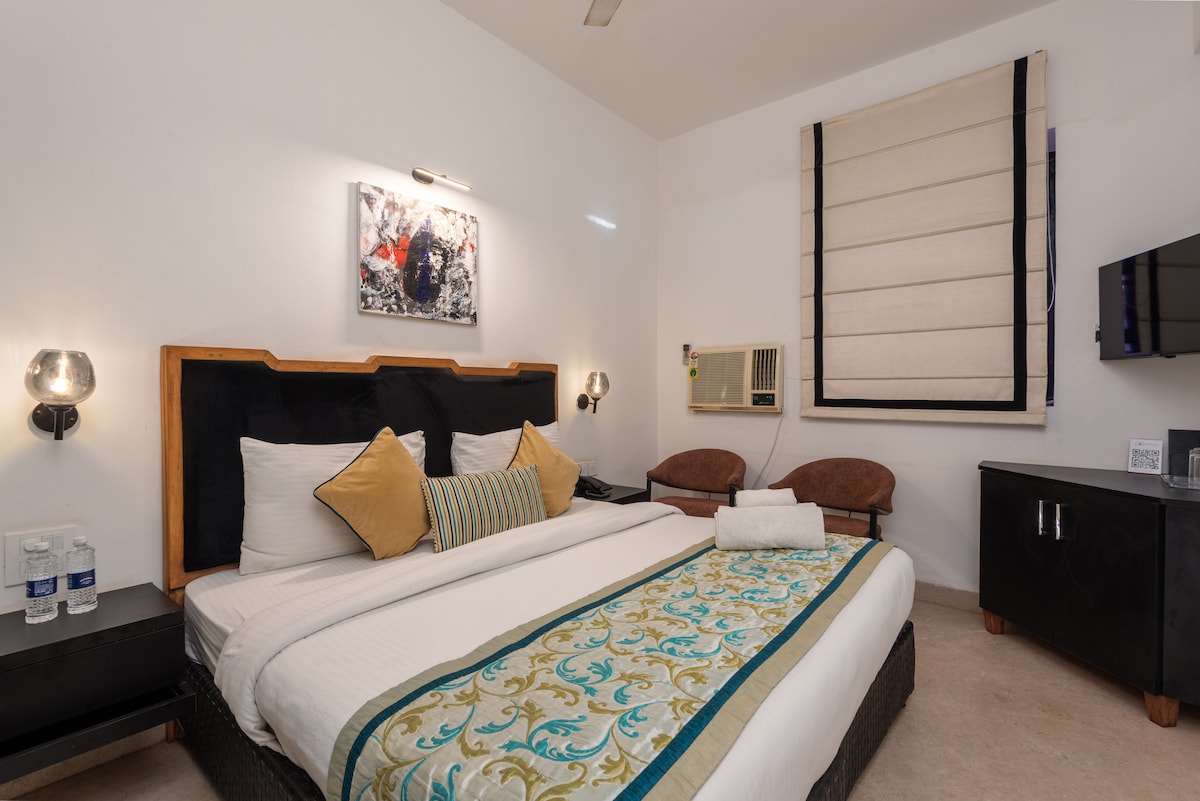 时尚加大双人床房间。咖啡厅和屋顶。Hauz Khas村
