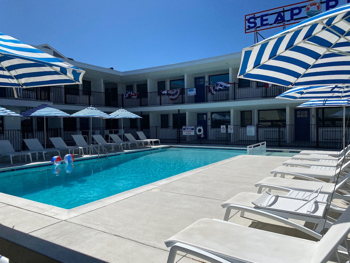 Seas the Day at Ashore Retreat! This cozy one-bedroom, one-bath retreat is thoughtfully designed for comfort and relaxation. Fully stocked with all the essentials, the unit features 3 beds (Q, F/F), fully equipped kitchen, fast Wi-Fi, Smart TVs, central AC & heat. Enjoy complimentary coffee, plush towels, and a guidebook to local attractions. One block to beach and Boardwalk, Morey's Pier, Gateway 26, Sam's Pizza. Free 1 car parking on site, outside showers, 2 heated pools, laundry on premisses.