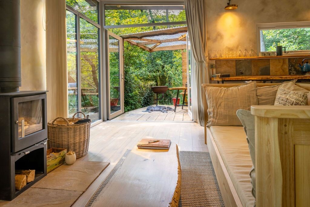 Designed and hand-built by your hosts, this spacious and totally unique cabin sits deep in nature, accessed by a private footbridge. Featuring charred timber cladding, panoramic windows, a powerful woodburner, and thoughtful design throughout, it’s the perfect off-grid escape—without sacrificing comfort.