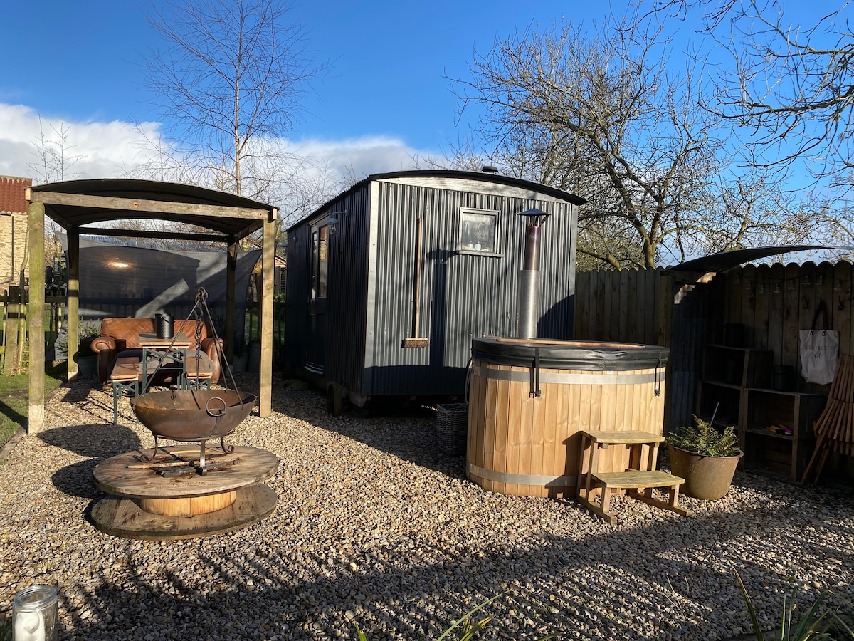 Come and stay in our beautifully finished, tin shepherds hut at the bottom of our garden. We are located in the rolling countryside with extensive views over the vale of York. After a day of exploring this AONB, there’s nothing like cooking tea over the fire pit or wood pellet pizza oven followed by a dip under the stars in our rustic hot tub. Fall into a fresh clean bed and wake up to the sound of the dawn chorus. Our bathroom barn provides all your needs for a morning freshen up!See you soon.