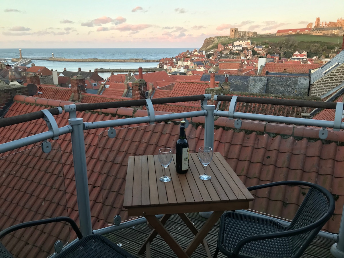The Crows Nest has undoubtedly one of the best views of Whitby from every window, and right in the centre of the town. A cosy loft apartment overlooking the harbour, the abbey and out to sea. Close to some amazing fish and chip shops, tearooms and everything central. A short walk to the beach.There is free on street parking with scratch cards that we provide in the W zones which are within a 5min walk from the flat. There is a pub directly opposite which at weekends you may experience some noise