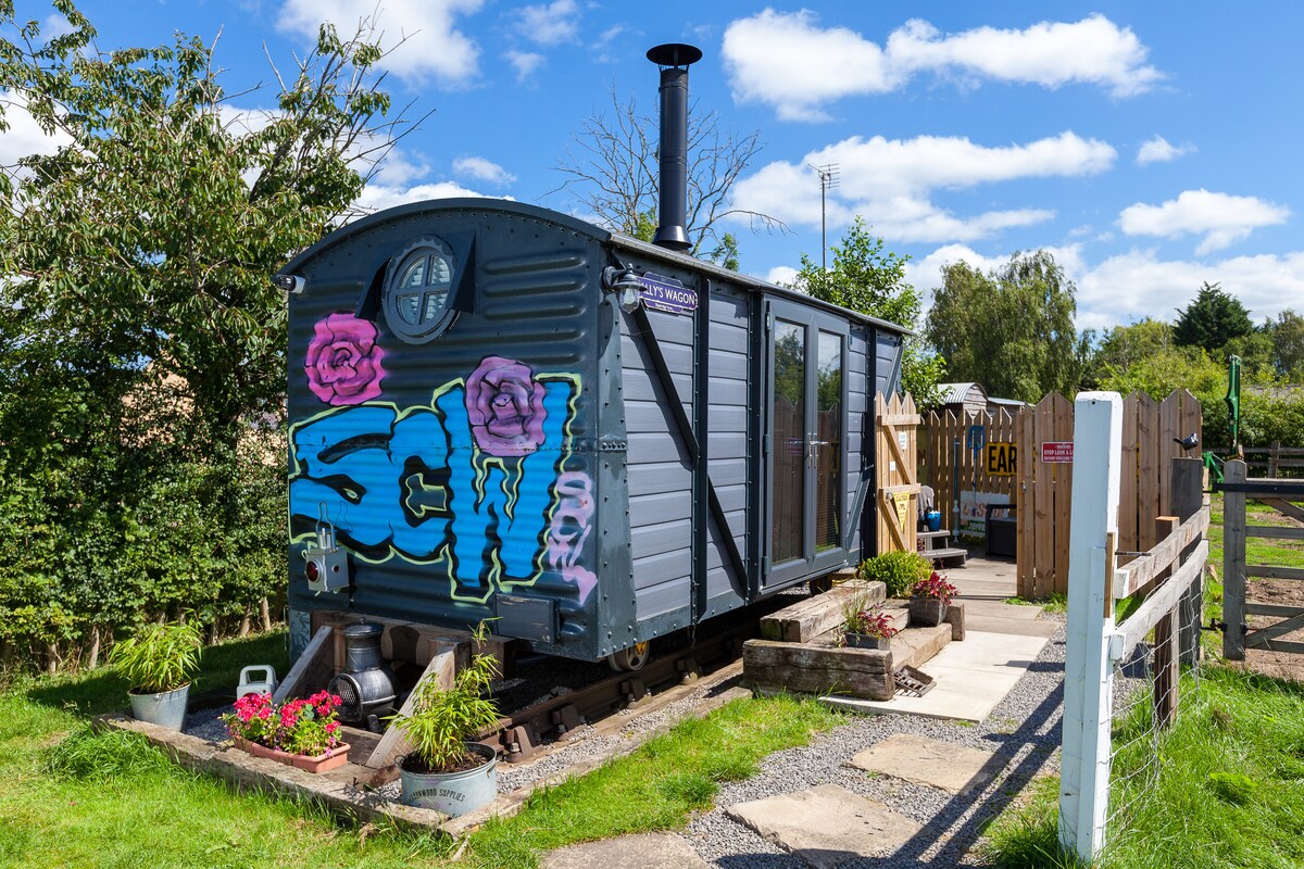 Our railway goods wagon ( Wally's Wagon ) offers railway inspired accomodation for couples , it has been carefully designed to be a bespoke bedroom space , and has an ensuite shower room and toilet . It is a quirky and intimate space, beautifully decorated, and ideal for a rural get away. It has a full size double bed, and is heated by a small wood-burner. The carriage stands in it's own garden area , looking out over paddock land. It has it's own private hot tub and an outside fire pit and BBQ