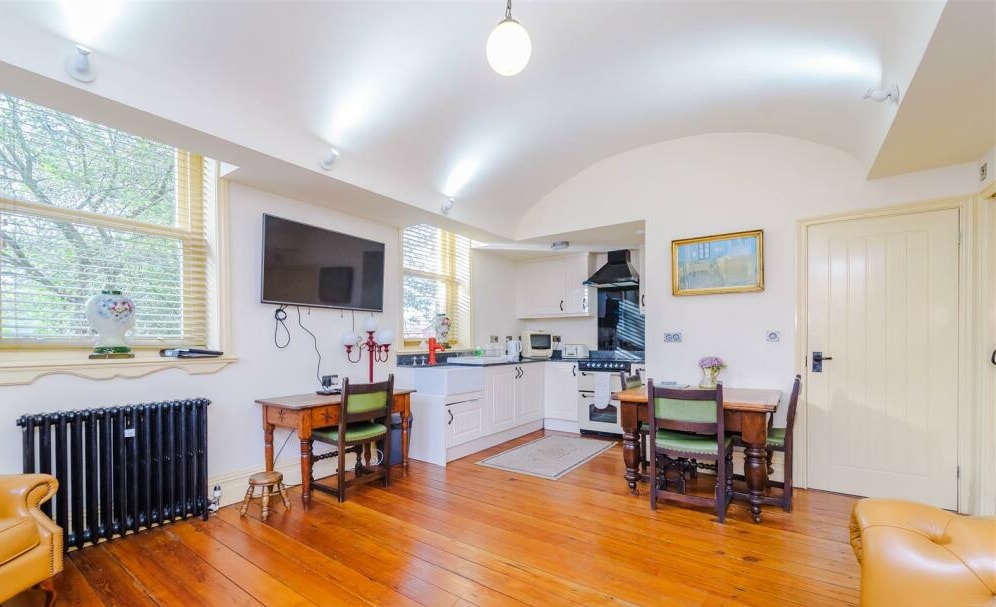 The ground floor accommodation is extremely stylishly appointed with a large, open-plan living/dining room which features Jacobean-style painted wall panelling as a stunning backdrop. Stone mullion windows, beamed ceilings, oak floors and doors lend a sense of rustic charm to the fabric of the building and yet there is every modern amenity. There is access to wooded and landscaped gardens with long-reaching views of the surrounding countryside and a private area to sit and enjoy the location.