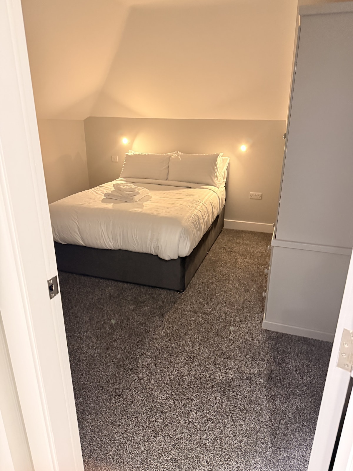 Newly decorated and furnished for 2021, you enter your private suite on the ground floor, walking straight into the new beautifully fitted kitchen complete with appliances, elegant dining area perfect for relaxed and cozy romantic candle lit dinners. Upstairs and you enter your warm living area with a small balcony with views of Baysgarth Park, furnished with sofa and matching chairs, soft lighting and a smart tv leading into the bedroom with it’s sumptuous antique french bed and en-suite.