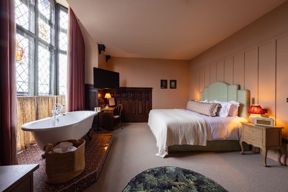 This all-encompassing, deluxe suite features a separation between dining and sleeping. The bedroom looks out over the immaculate Abbey Gardens and is furnished with a plush king bed, stylish desk, seating area, ample clothes storage and a stunning en-suite bathroom. The fully equipped kitchenette (including a hob, microwave-oven, kettle, utensils, pans and crockery) is carefully partitioned to allow for a spacious dining table and cooking area.