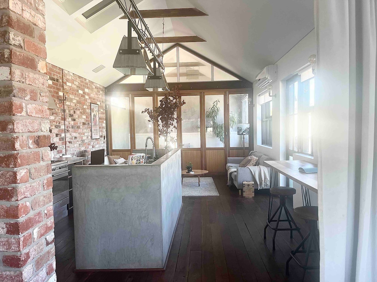 Original detached artist studio newly repurposed into self-contained, stylish accommodation for 2 people in best, quiet and central location - walking distance to everything. Owned by artist and gallery owner, this studio has huge 5m high raked ceilings, large light-filled luxurious bathroom w/ deep bath, quality furniture and art collection. Completely private and secure w/ own lane entrance, unlimited easy parking and council approved and registered.