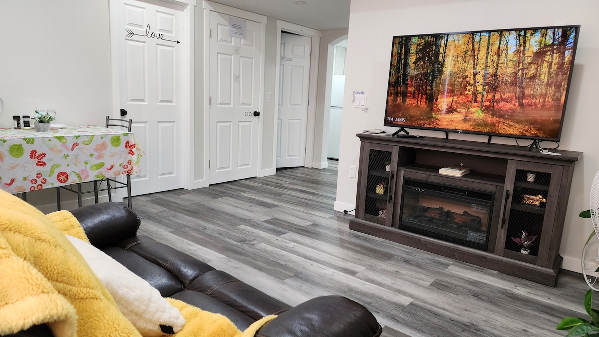 Modern full, bright, high ceiling basement suite. Separate entrance. It features tasteful décor and new appliances. Relax on the spacious sofa in front of the fireplace. Or enjoy the sunshine on the patio with comfortable patio furniture. In the evening enjoy the outdoor gas fireplace or take a dip in the hot tub. When you're ready for bed, an exceptionally comfortable queen bed awaits you. We are located next to the highway, and 5 mins from the airport.